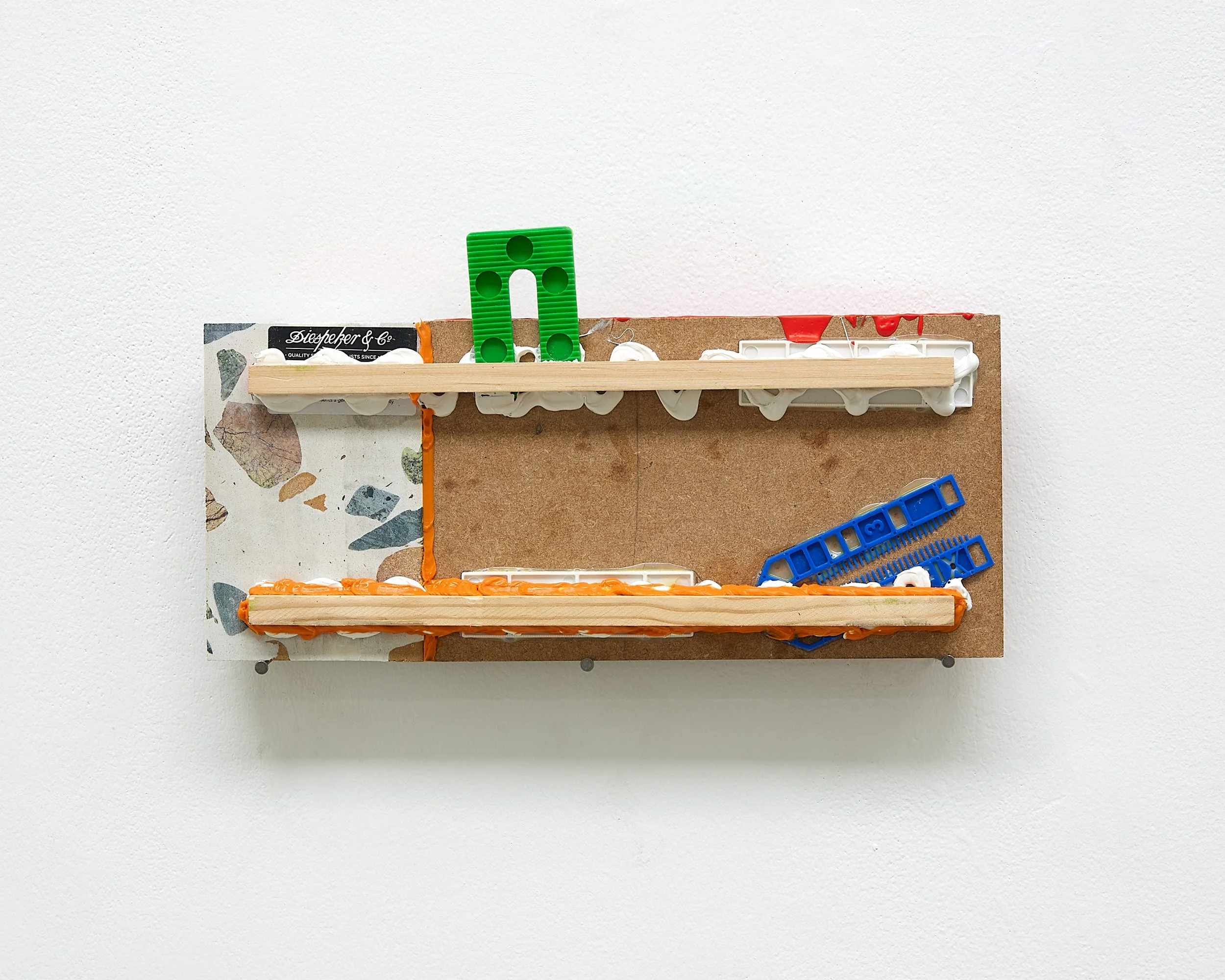 ‘Enjoy’ badge from 2005 Vauxhall Corsa, MDF, Terrazzo, Plasti-kote, Pine sections, Evo-Stik Sticks Like Sh*t All Weather Adhesive, Rainbow sealant, Broadfix shims in various sizes.