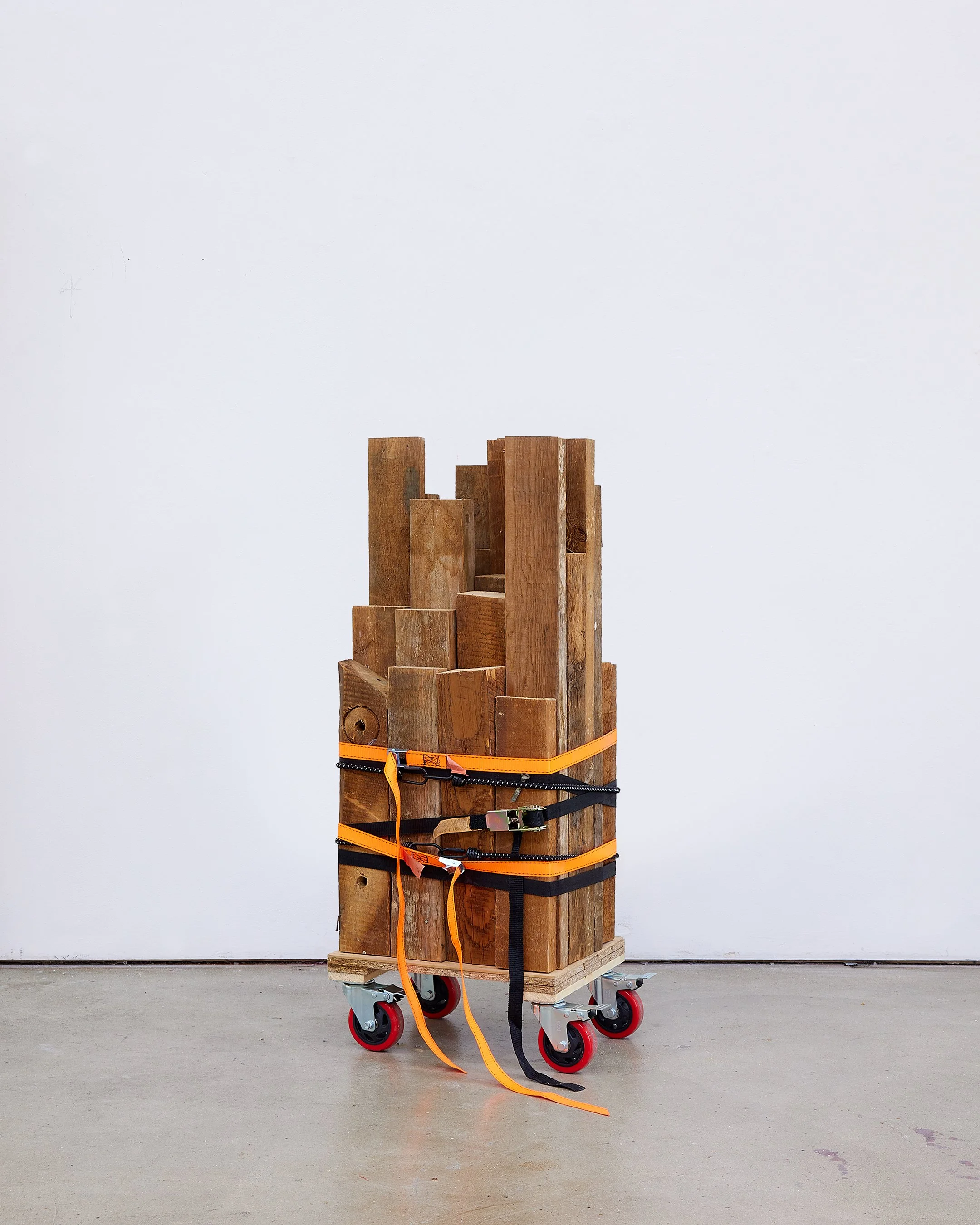 Bungee chords, ratchet straps, industrial caster wheels, MDF and chipboard, metal fixings, slow grown Canadian Pine from the roof of my house.
